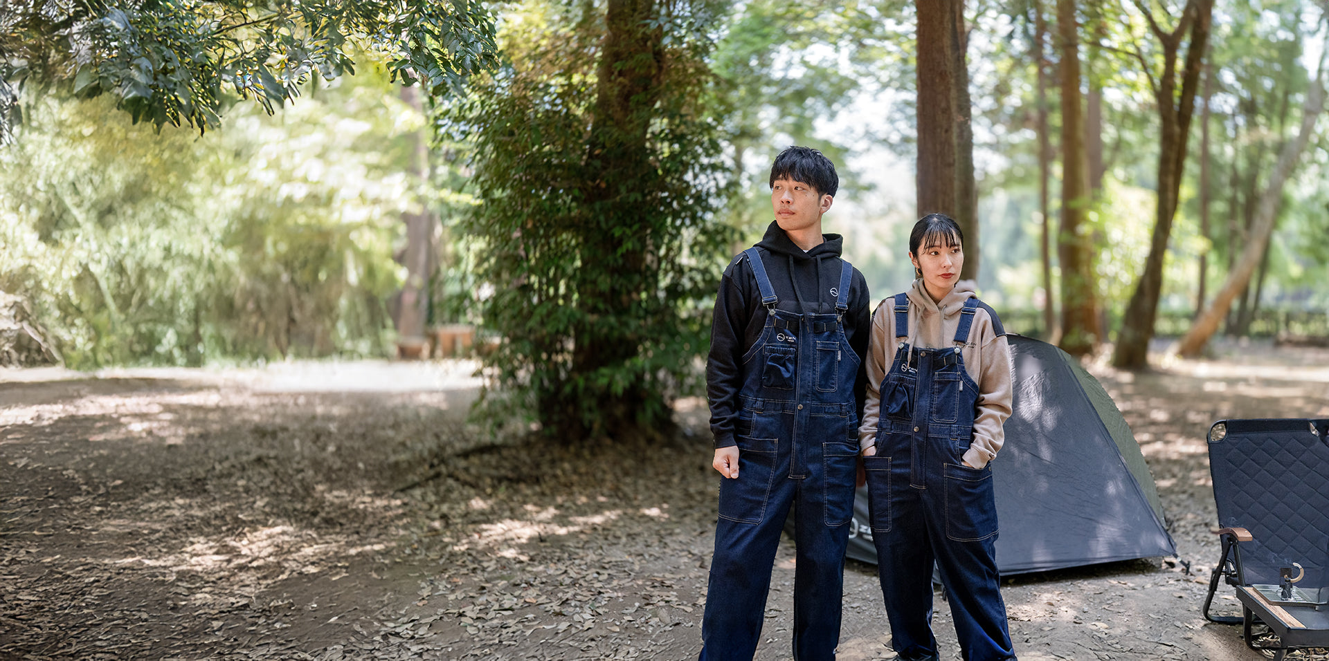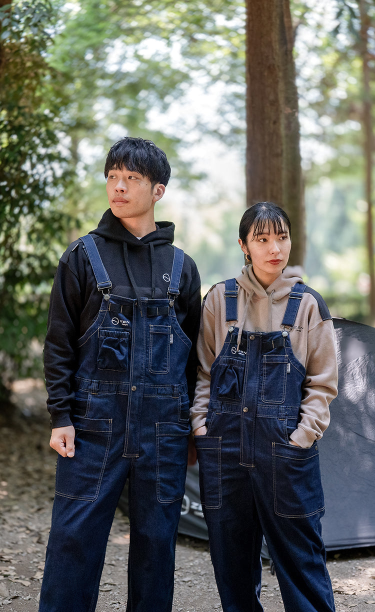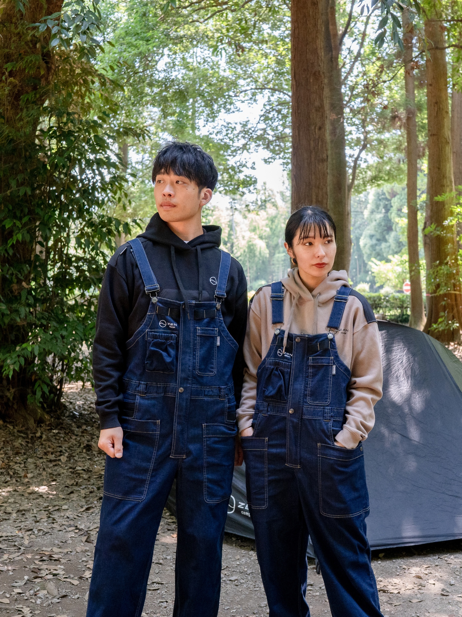 オリジナルパーカーにマッチする「着たままトイレができるオーバーオール」も販売!