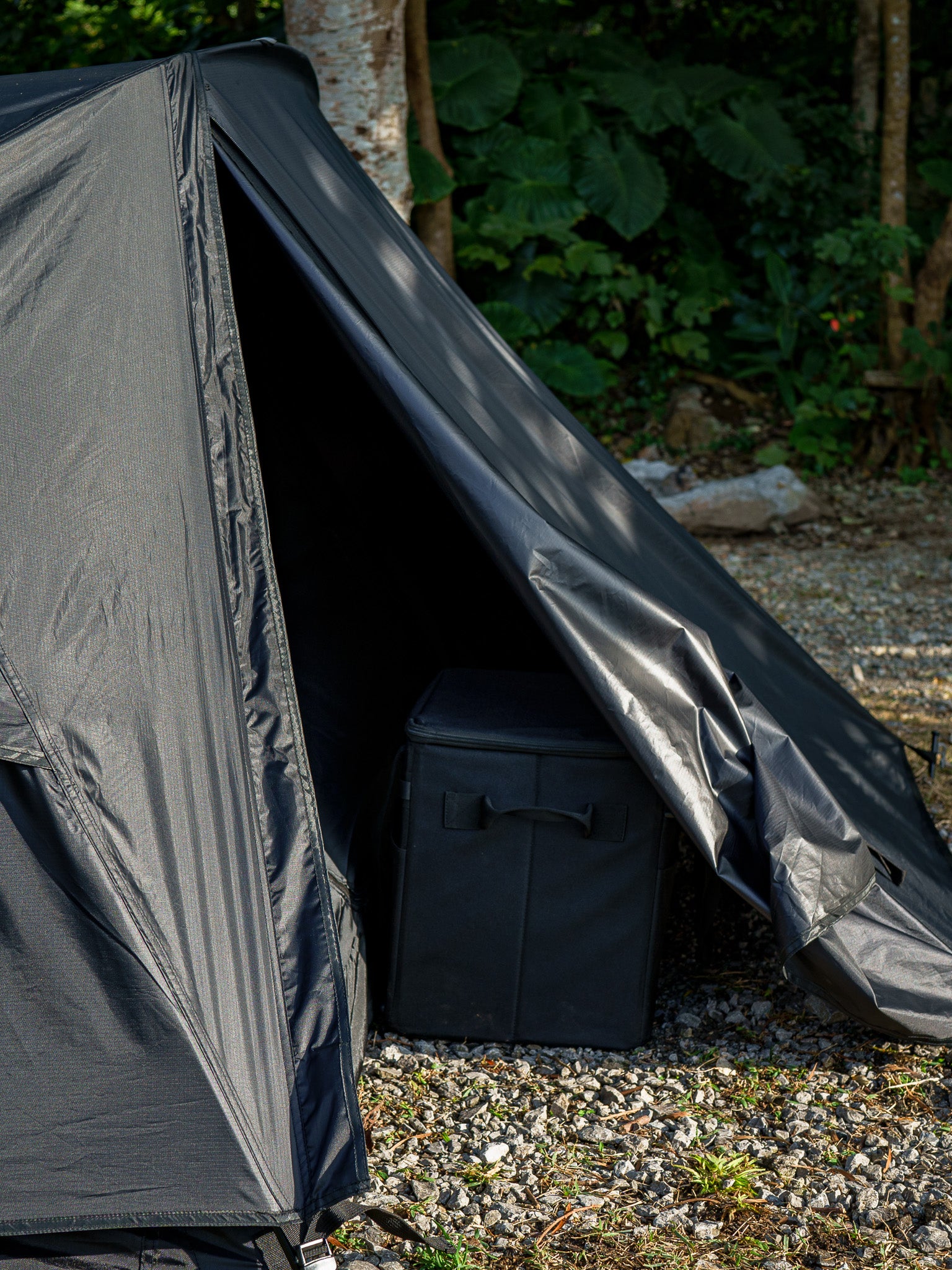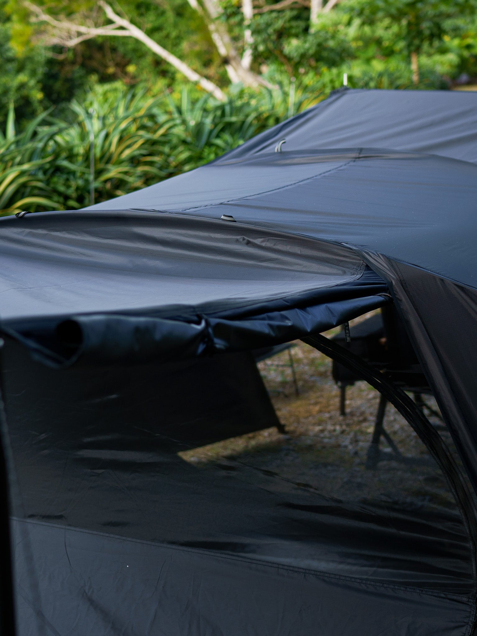 ZEN Campsらしいブラックカラーをベースに、1人で余裕のあるスペースを確保できるソロキャンパー向けのドーム型テントです。組み立てる工程が少なく、パーツも軽量で扱いやすいため慣れれば5分程度で組み立てられます。風通しも良く、別売りで販売するポールを使って前後を跳ね上げることができます。