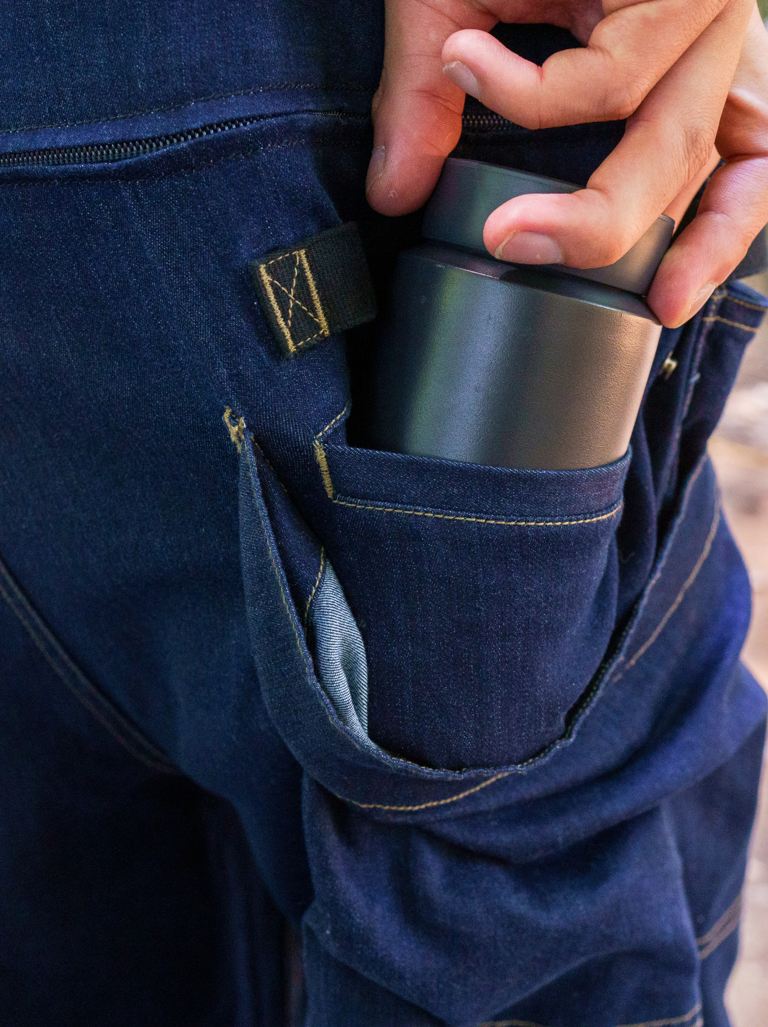 オーバーオールを着ていてもポケットを扱いやすくするために、ポケットの位置を通常よりも上に取り付けているのが特徴です。