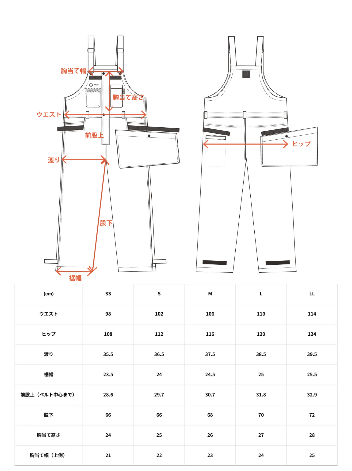 ジッパーを全開にすると、前方がこのように大きく開くため非常に着脱しやすく、オーバーオールを着る際の煩わしさが解消されます。