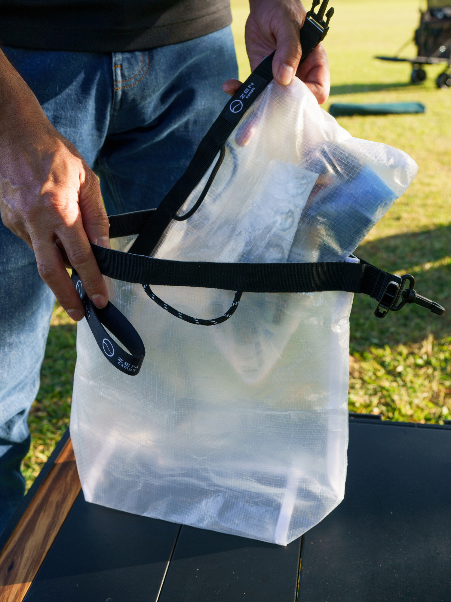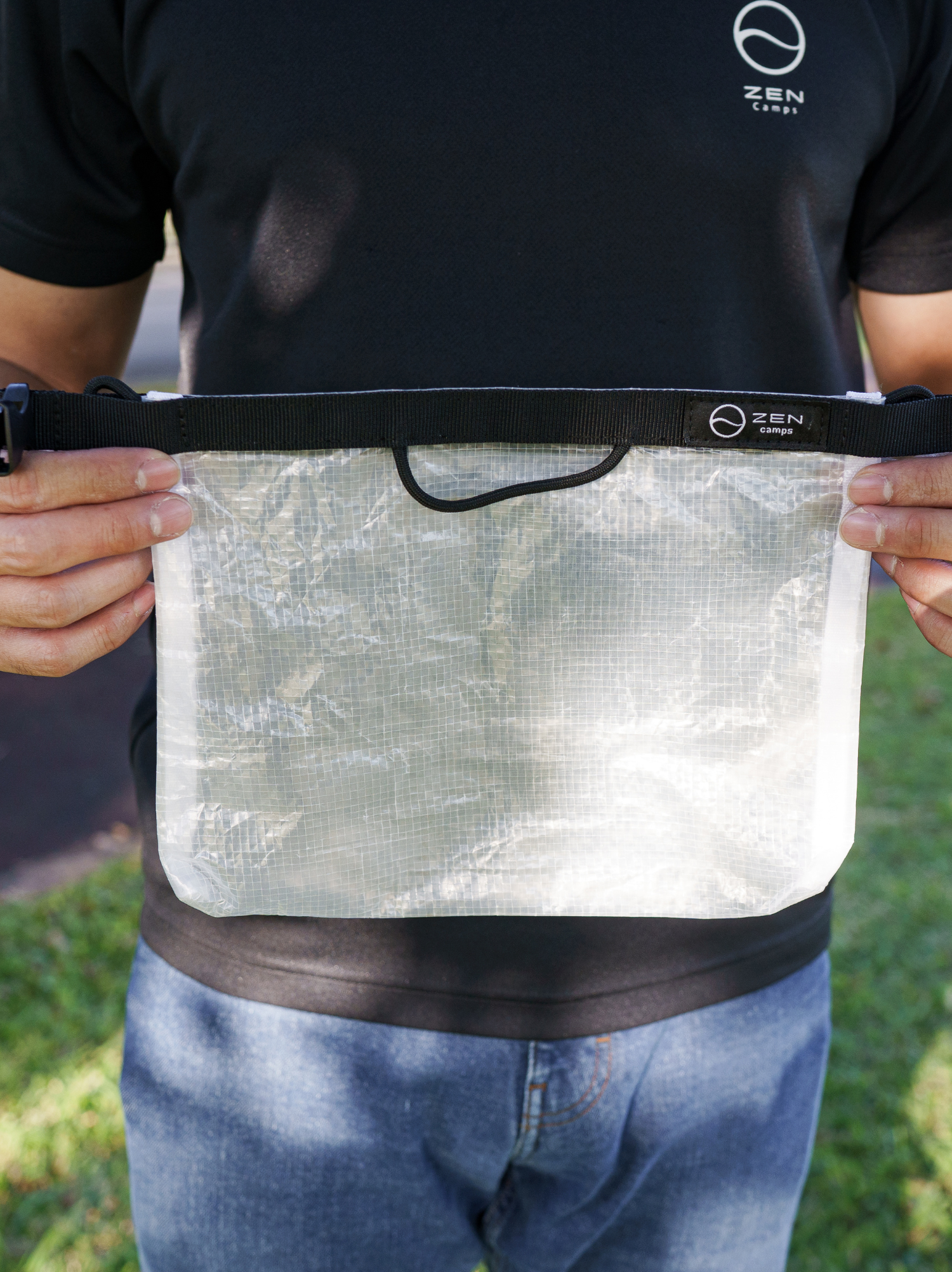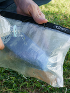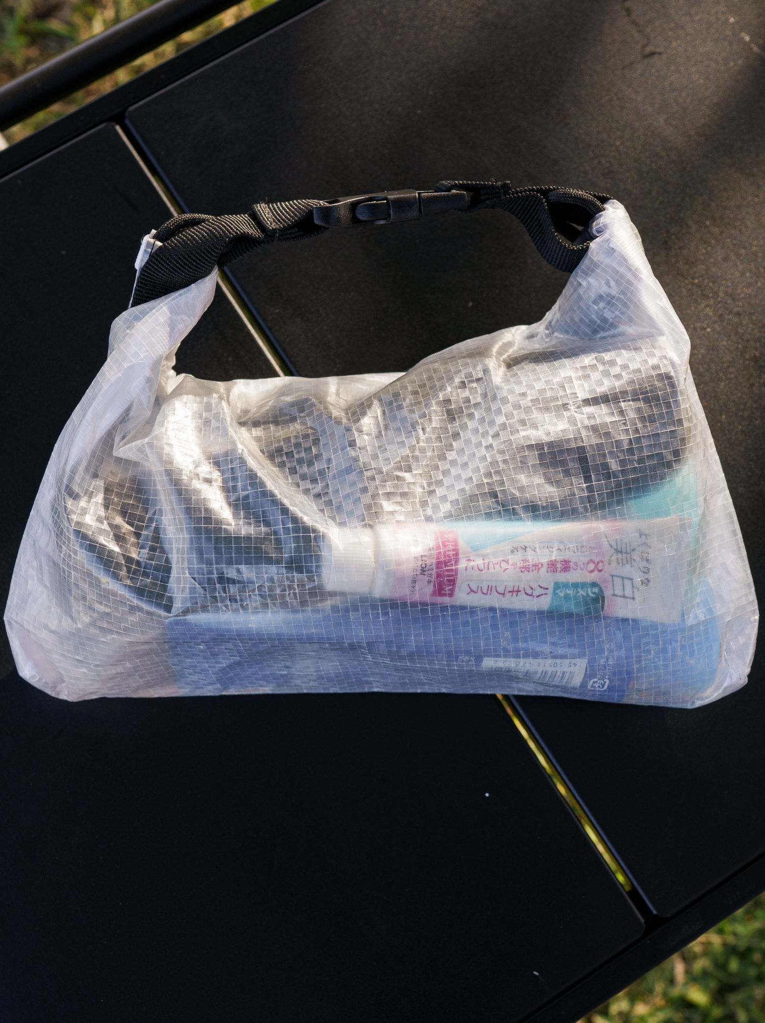 本製品には防水素材を使用しておりますが、縫製部分につきましては構造上、完全な密閉はされておりません。そのため、袋内部に多量の水が溜まった場合、縫い目から水漏れが生じる可能性がございます。
