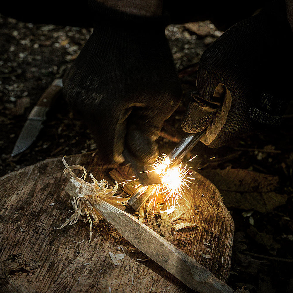 - 火花を散らすためには、ロッドを削る量、瞬間的に摩擦熱を発生させる、この2点が重要ですが、6角形のロッドは円形のものと比較して、ストライカーとの接地面積を広く取れるため、ロッドをより削り摩擦熱の発生が容易で大きな火花を散らすことができます。