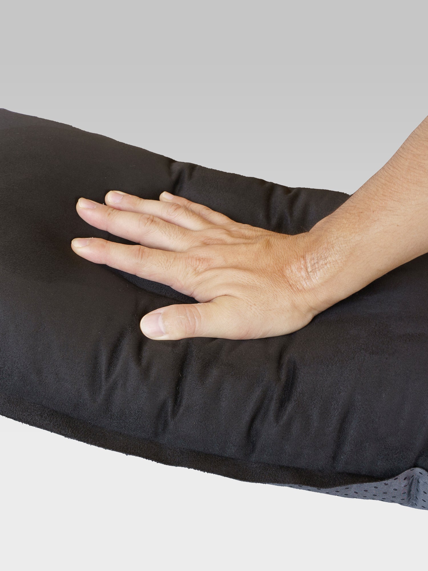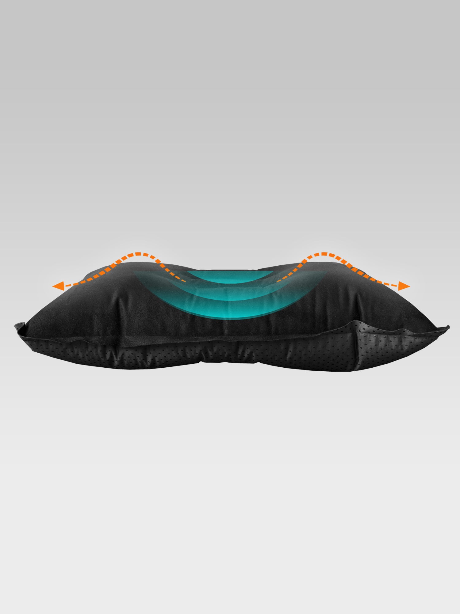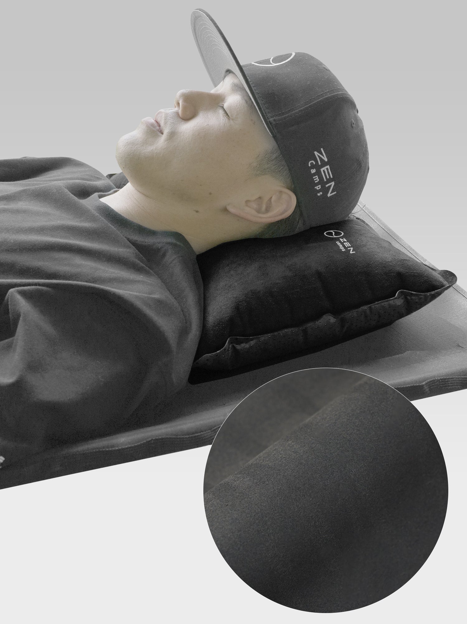 表面の生地には肌質抜群のマイクロスウェード生地を採用し、快適な寝心地を体験することができます。外側の膨らみが首を支え、真ん中の窪みに頭がフィットするため、キャンプの朝にありがちな首や肩のコリも軽減してくれます。