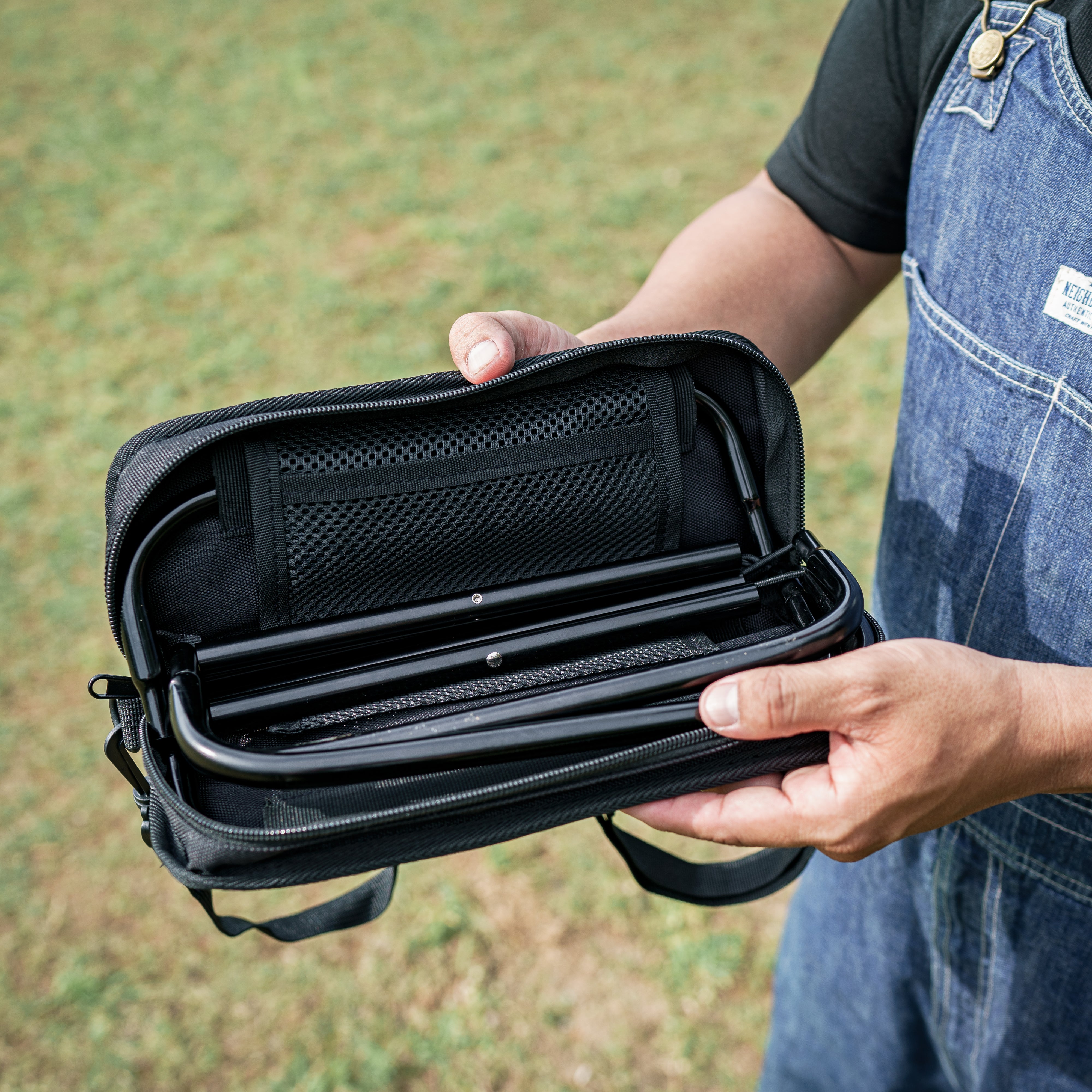 収納時はコンパクトで、ショルダー紐付きなので肩に掛けて持ち運び可能!収納袋が一体型なので1つで完結できるのも嬉しいポイント!