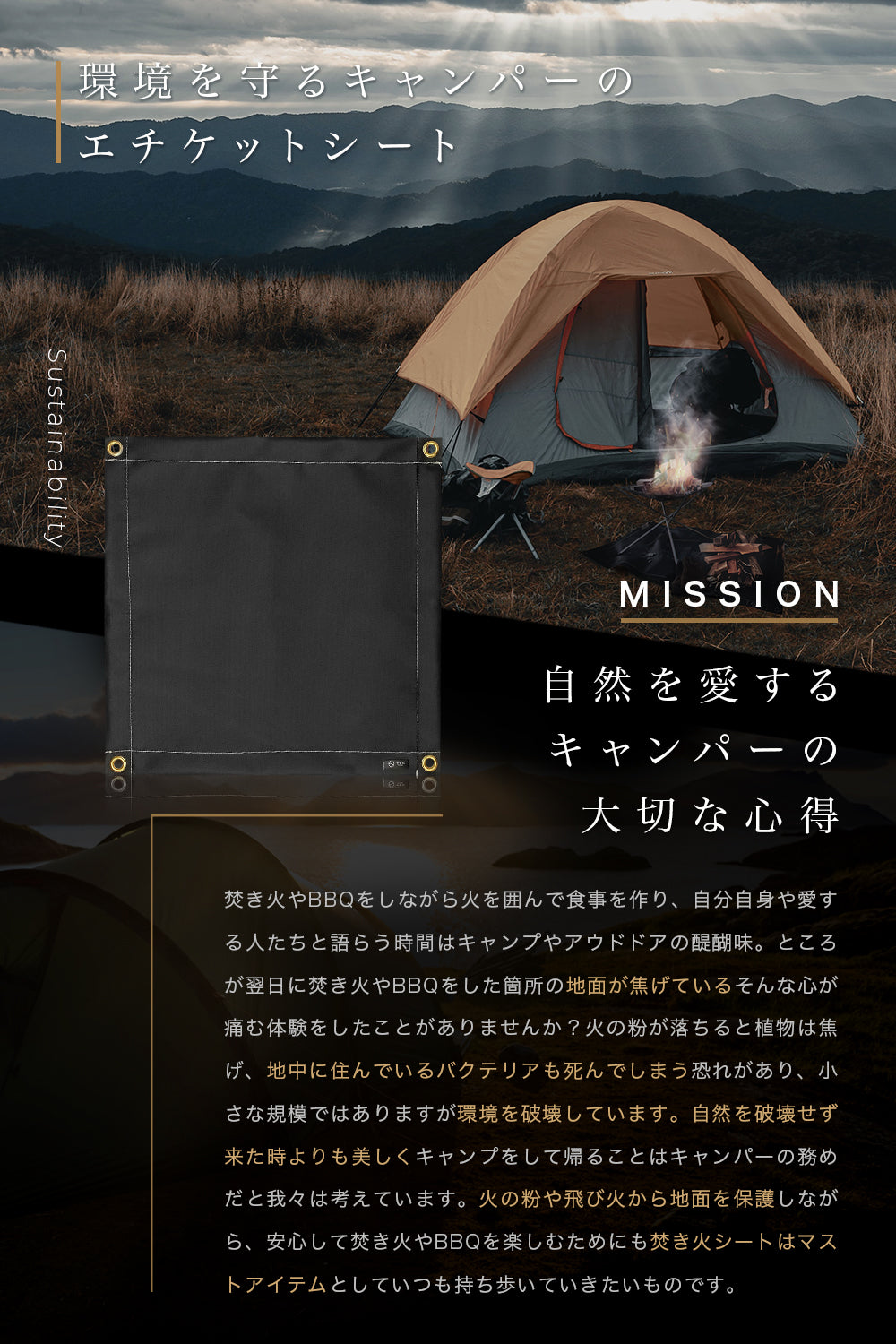 焚き火やBBQによる飛び火で地面を傷めないのはキャンプの基本マナー。焚き火台やグリル台からの飛び火等による地面の植物や地中の微生物への被害を最小限にするために是非焚き火専用シートをお使いください。