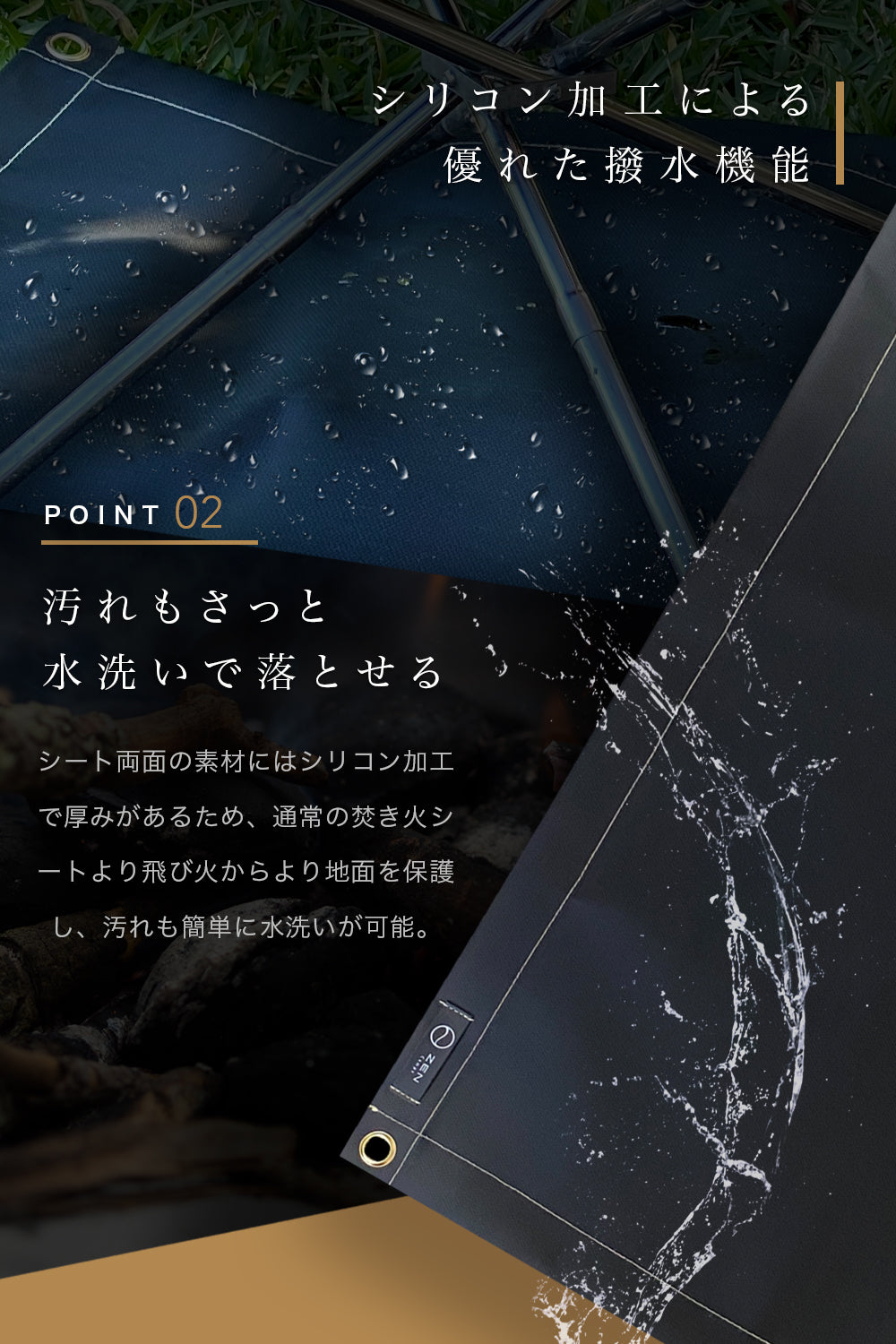 ⛺️素材:シリコン加工を施しているため、軽くであれば水洗いも可能。通常の焚き火シートよりも厚みもあるため、より飛び火から地面を保護します。