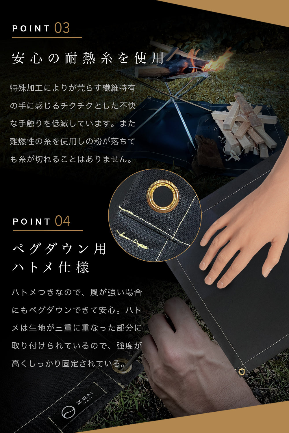 ⛺️ 難燃性の糸を使用しているため、火の粉が落ちても糸が切れることはありません。