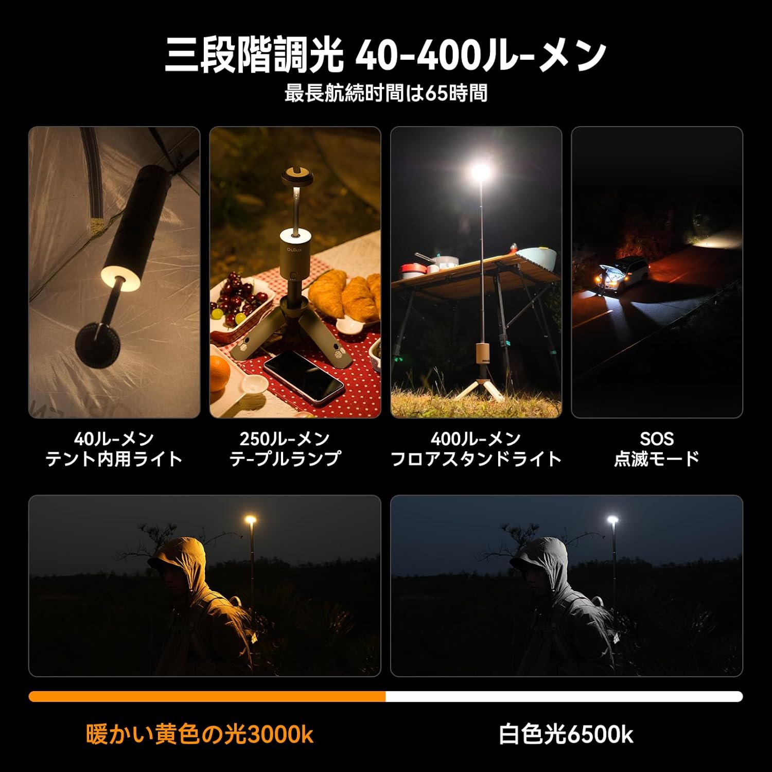 柔軟な照明範囲:3つの照明モードを備えたこのポータブルLEDキャンプライトは、自在に変更できる3つの調節可能な明るさレベルと暖色/寒色の光という、さまざまなオプションをユーザーに提供します。ニーズに合わせて明るさ、形状、ポールの高さを調整できます。この充電式屋外キャンプ用ライトを使用すると、あらゆる状況に合わせて照明範囲を簡単にカスタマイズできます。