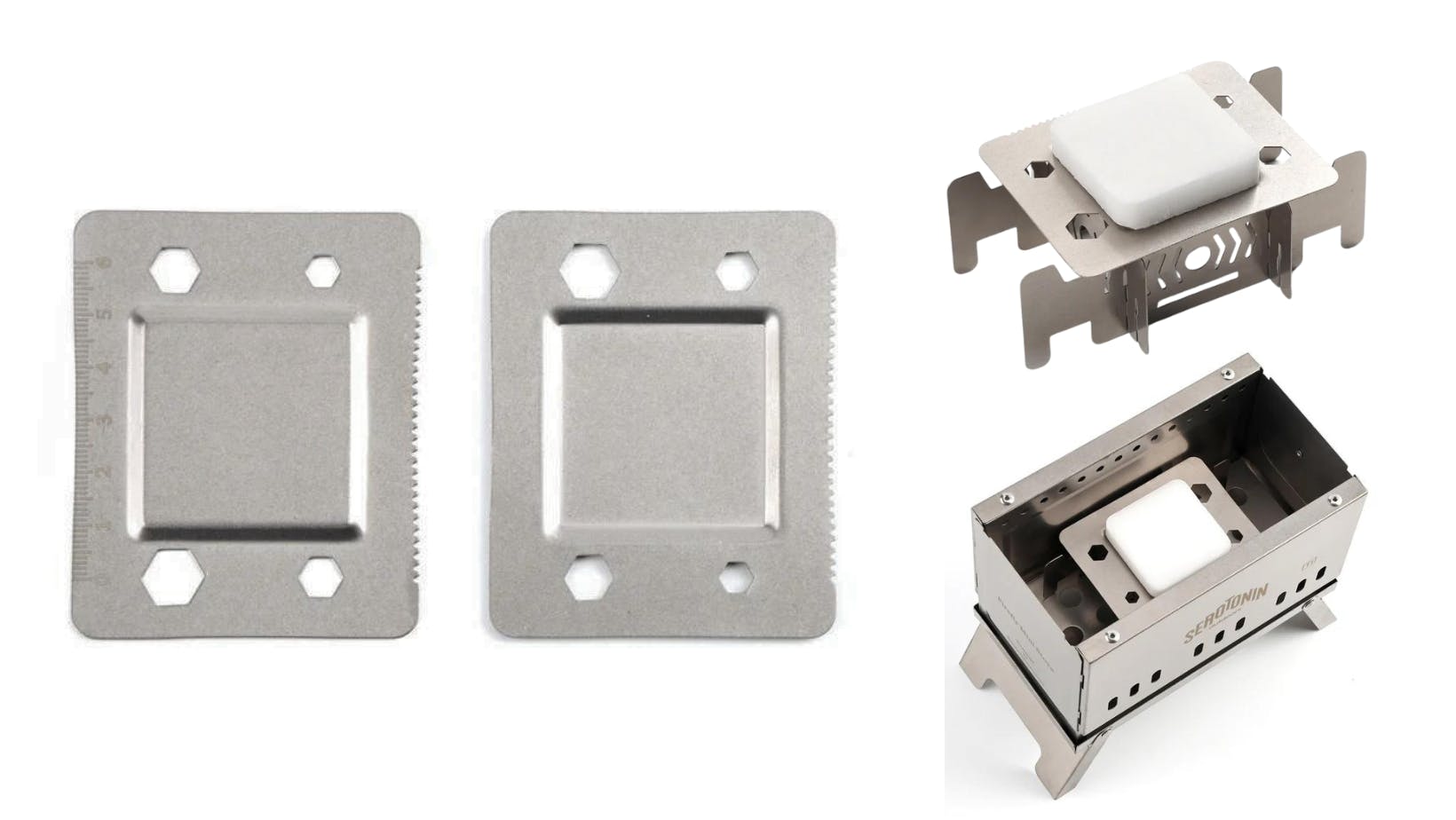 固形燃料置いて安定した燃焼をサポートする役割があります。また、上部には長さを測れる定規、下部には小枝などに切り込みを入れるためのminiノコギリがついており、左右の穴は六角レンチとして使用するこ