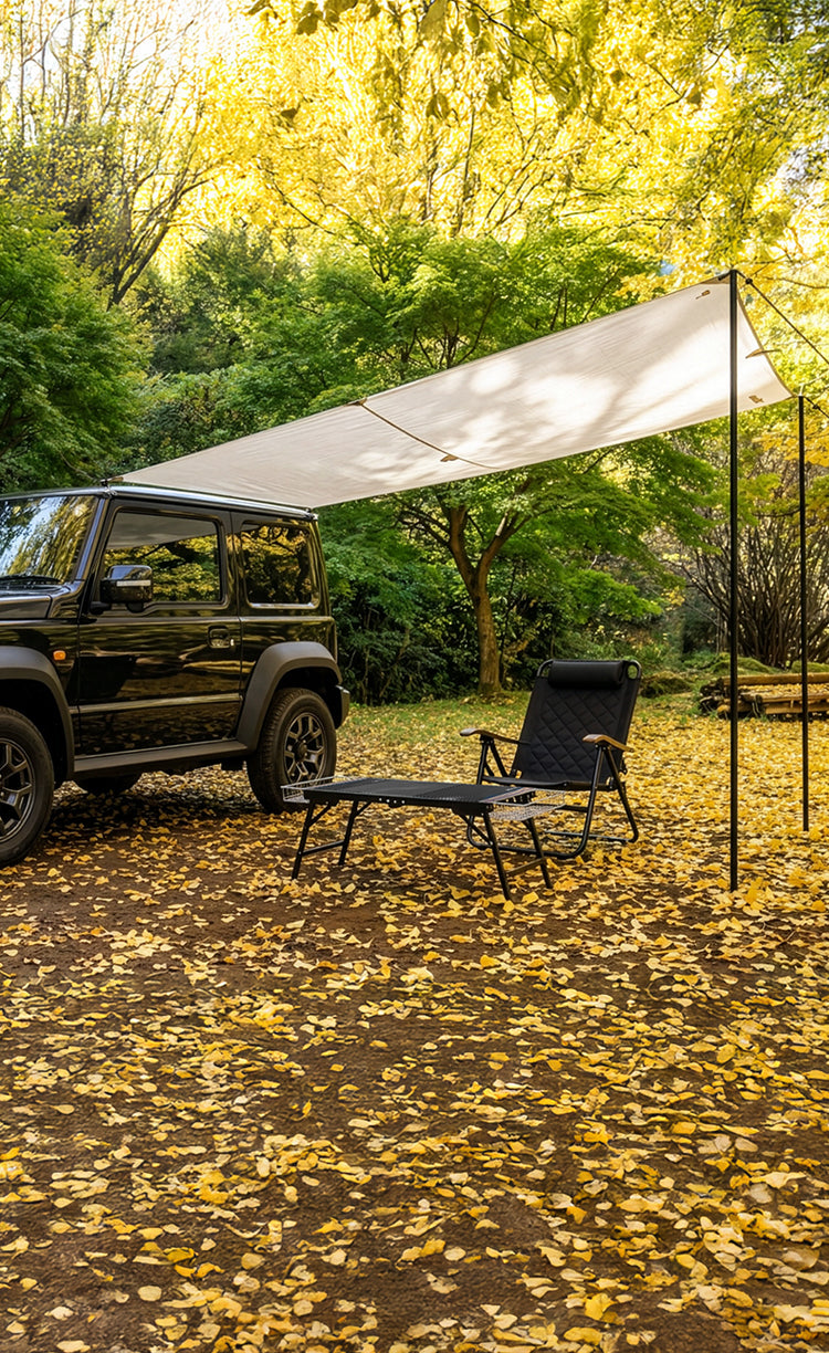 一般的にタープを掛けるフックは1つのものが多い中、こちらは左右に2つのフックを設置。左右両方に掛けることでより強固で外れにくい構造にしています。