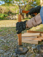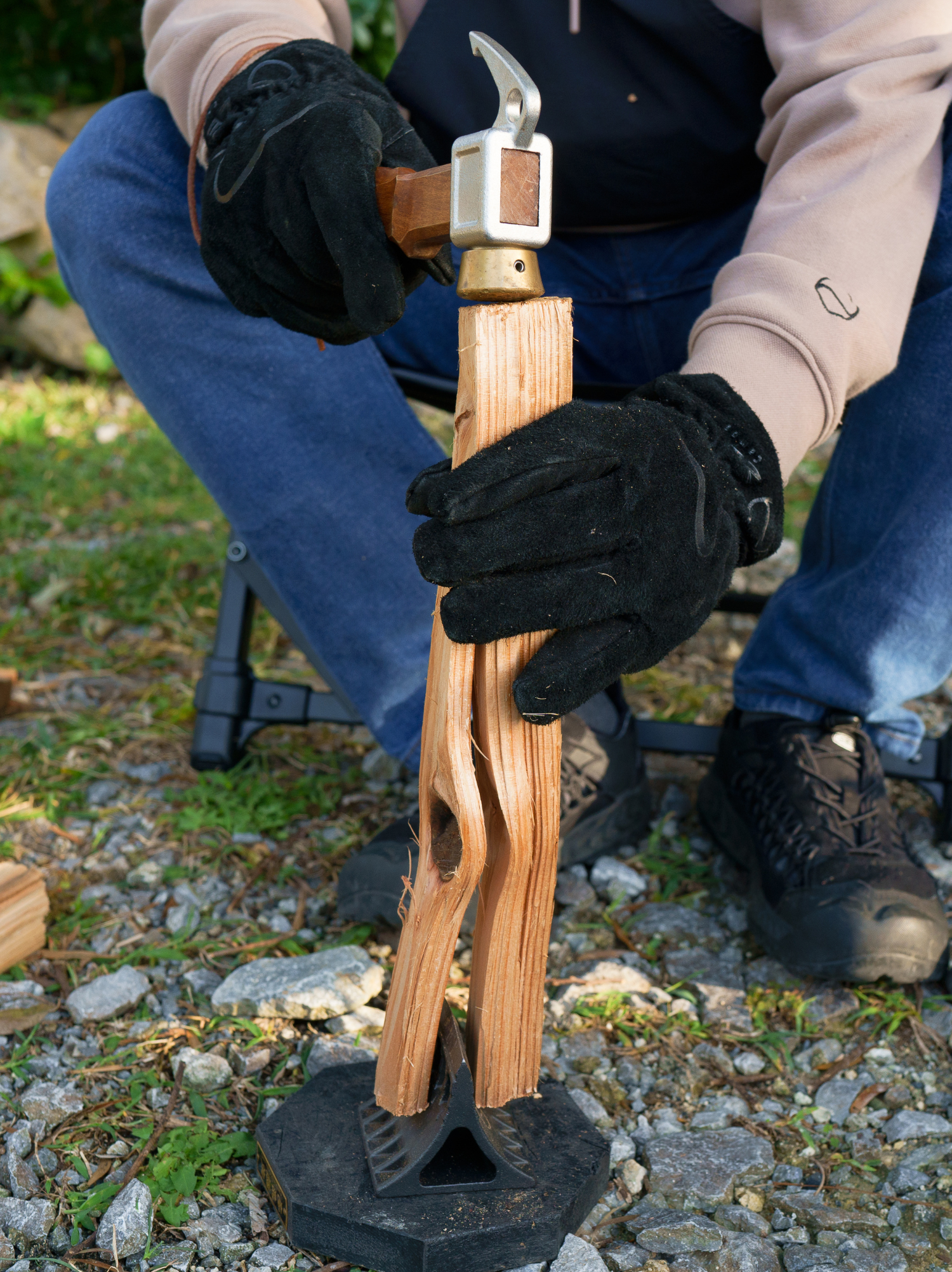 今回の「刃冠(ばっかん)」は地面において使用するタイプのくさびで安定性が高く、上からハンマーで叩くだけで簡単に薪割りができます。苦労する薪割りもこれで簡単に、子供や女性でも楽しく行うことができます!