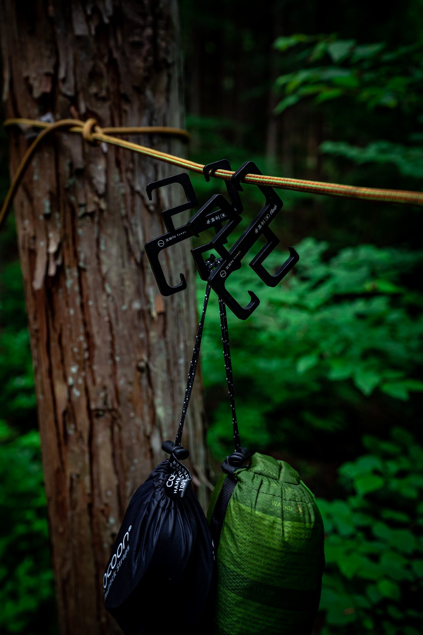 ・キャンプに行くと物の置き場に困ることがよくあります。テーブルやラックを出して、その上にものを置くのも良いのですが手間がかかったりスペース取ったりします。テントやタープを設営するときにガイラインは必ず使うので、そのロープに手裏剣フックを固定してものを吊るすことでロープを有効活用できます。